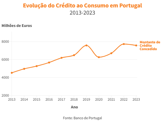 Nos últimos 10 anos, o valor total de crédito ao consumo em Portugal tem apresentado um crescimento constante, subindo de 4.522 milhões de euros em 2013 para 7.565 milhões de euros em 2023.